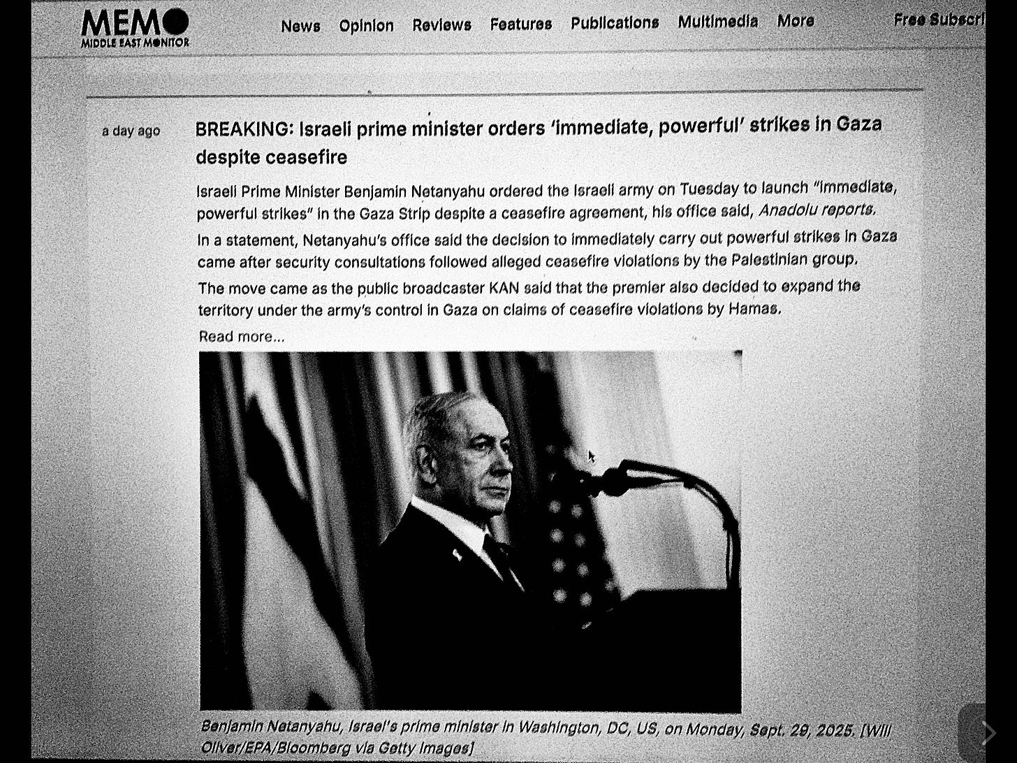 After unleashing a wave of bombardments on the night of the 28 of October, declaring to be a retaliatory strike for the death of one of his soldiers allegedly killed in the yellow zone of Gaza, area in which no Palestinian is allowed, and bombing which have so far returned the bodies of at list 119 martyrs, as more bodies along with other civilians have already died in consequence to their wounds and hundreds of wounded, and with more bodies still trapped under the rubles of their bombed out homes and shelters are still a accounted for, following a message by hamas which denied the attack and declared to be ready to hand over the remains of two more Israelis killed in Gaza by the israeli bombardments, the once again, Genocidal and wanted war criminal prime minister of israel have declared to have ordered for the bombing to stop and to have gone back to the so called ceasefire agreement.