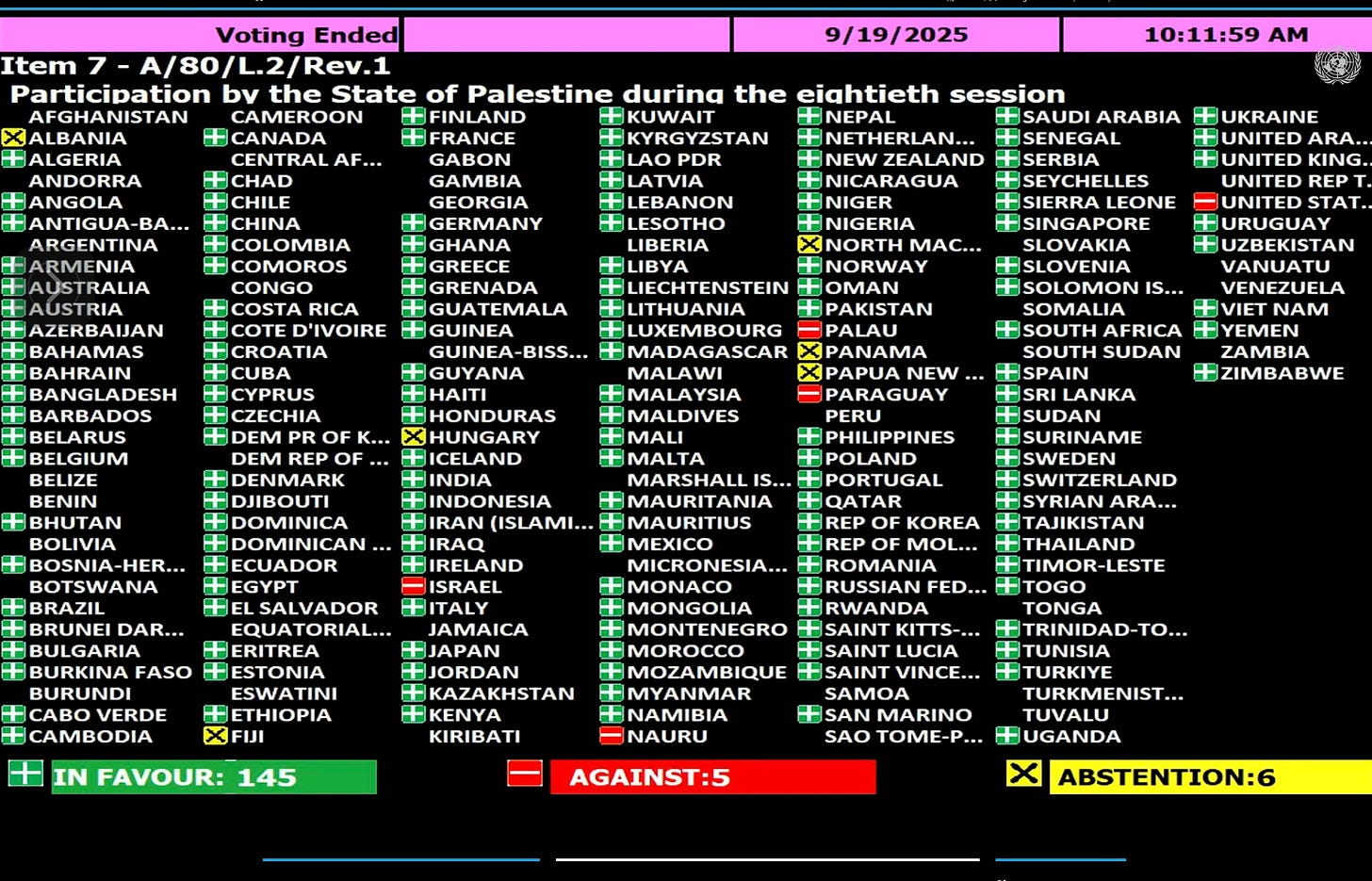 Voting against the recognition of Palestine US, israel, Argentina, Micronesia, Nauru, Palau, Papua New Guinea, Paraguay, Tonga.